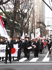 集合場所の坐摩神社境内に関係団体の方々を中心に約350名が結集、セレモニー後に出発、御堂筋を本町から元町まで約2キロを1時間かけて「祝祭日には国旗を掲げましょう」のアナウンスに合わせ、国旗の小旗を「あげましょう!」と声を上げながら打ち振り、通行人にアピールしていった。天候もまずまずで比較的温かく、思い切り声を上げての行進は大変気持ちよかった。