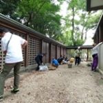 最初に本殿・拝殿で国歌斉唱、正式参拝、境内でラジオ体操をしてから清掃に入った。普段入ることがない御垣内と玉垣周辺での草取り、箒での枝葉集めが中心だった。御垣内に入る前には藤江宮司からお祓いをして頂いた。前回も参加されている参加者もおられたので、作業をスムーズに進めることができた。子供も一生懸命お手伝いしていた。給水の時間をしっかりとってから11時まで作業をした。