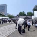 8月15日㈮、オスカードリームホールで開催される「終戦80年戦没者追悼祈念講演会」の会場設営の後、正午からの大阪護國神社で斎行された「終戦詔書奉戴の日祭」に参列した。拝殿・本殿、境内におられる人、等しく英霊に厳粛に慰霊と感謝の誠を捧げた。お祭りの中では書家の方が「鎮魂」と気迫のこもった揮毫を披露された。終戦80年の節目ということもあり参列者が多かった。